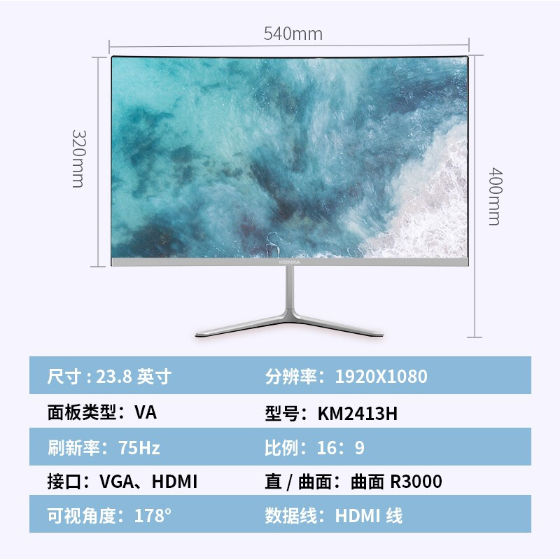 康佳(KONKA)23.8英寸 白色 曲面屏 FHD 全高清 低蓝光 HDMI接口 可壁挂 电脑液晶办公显示器 KM2413H